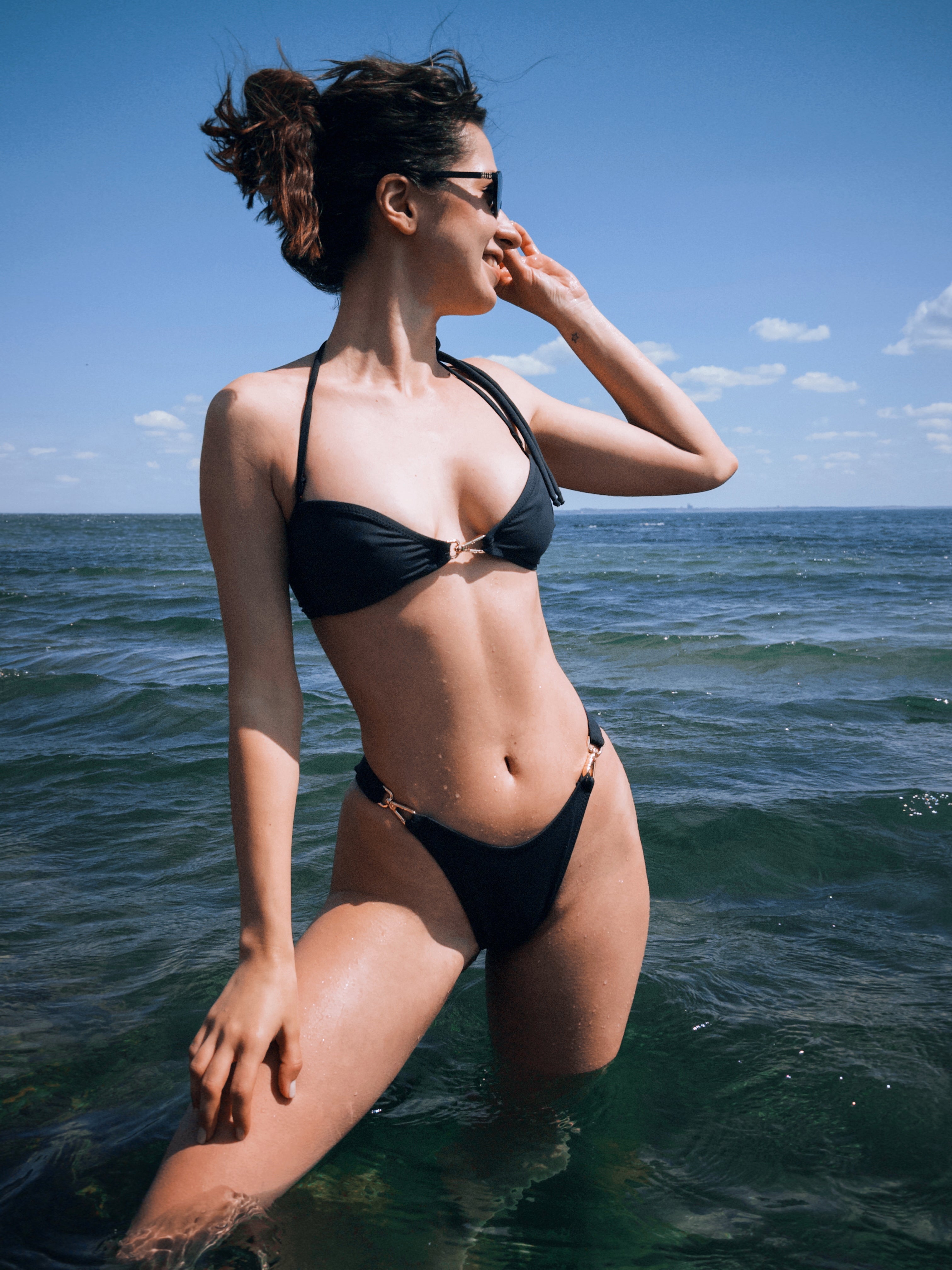 Bikini top design:triangular cups, adjustable, rear tie fastening, different variants of straps position, transformer bikini top
