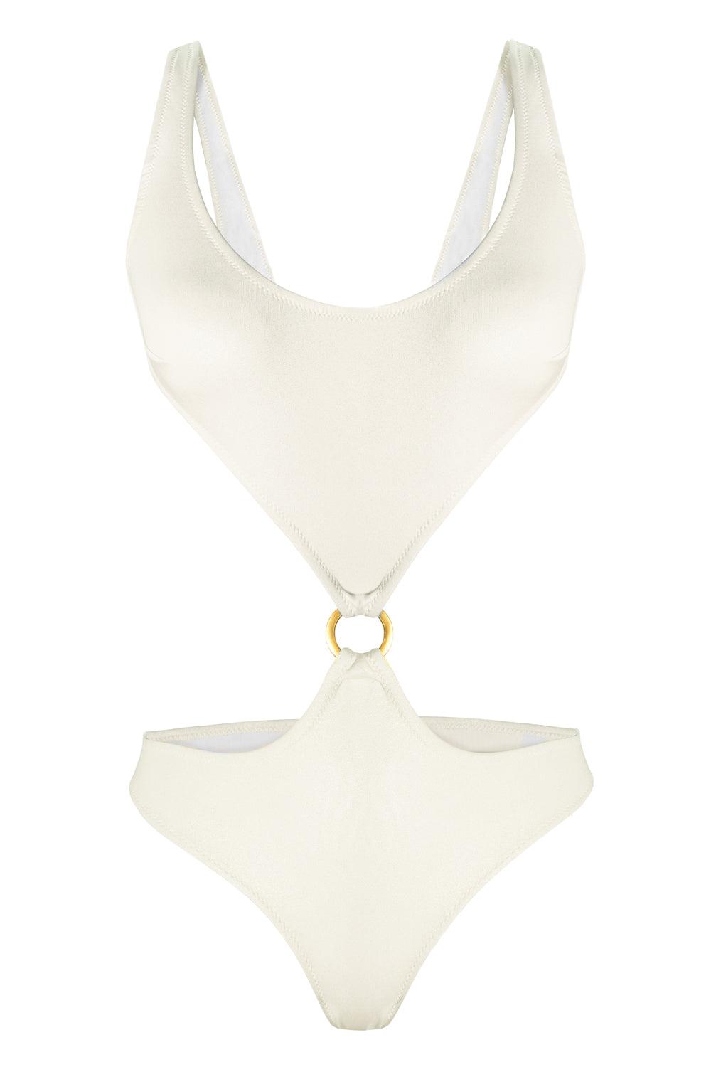 Titaniya Gold Ivory tank swimsuit will make any beach day a cosmic one. It features a U-neck, a back tie fastening, and cut-out details. Titaniya's light shine shimmers beautifully in the sunlight. Also, the swimsuit is suitable for summer parties.