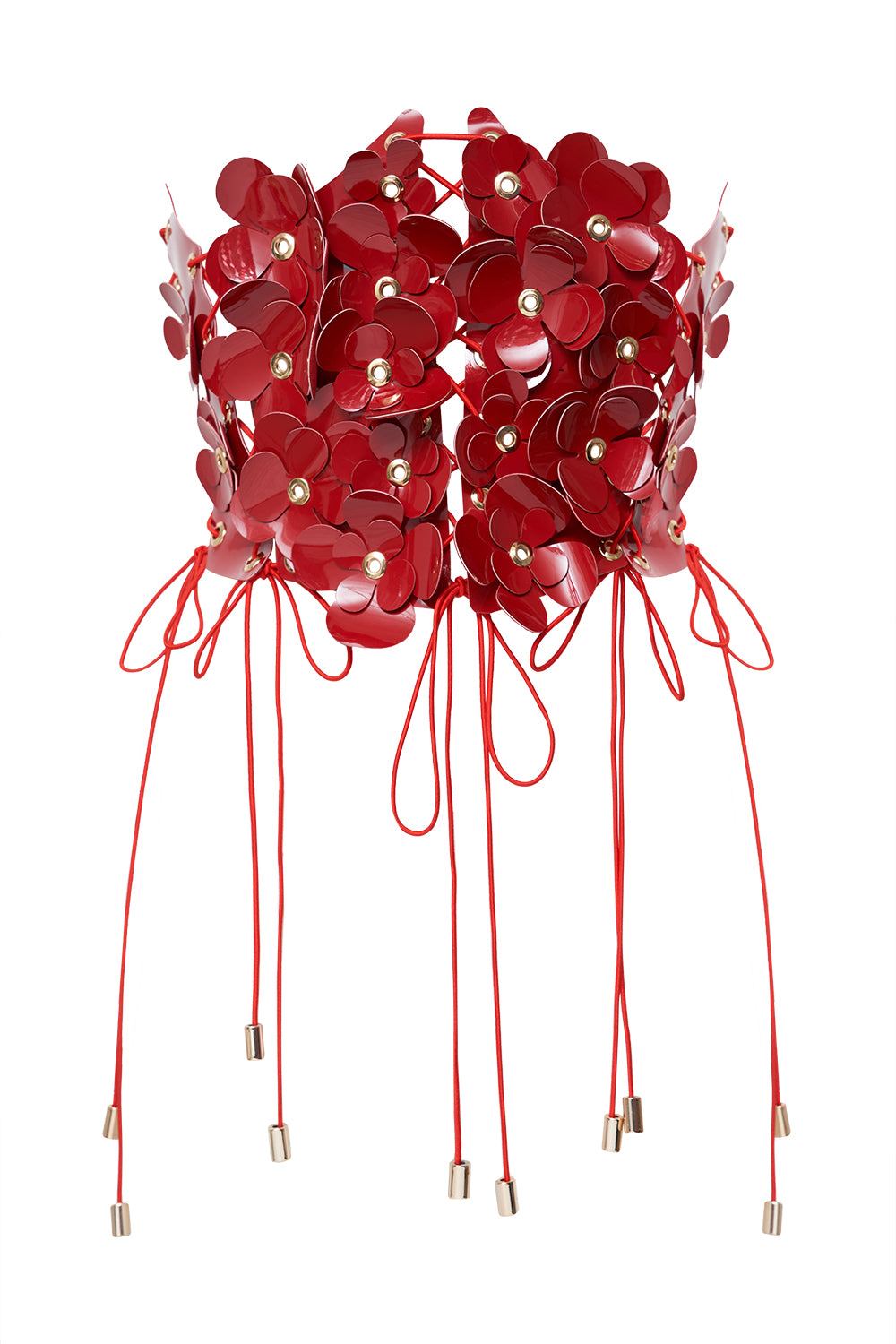 Manufacturer (brand): yesUndress Texture: Glossy Color: Red Design: Adjustable open corset with flower decor The main fabric: Patent PU leather Lining fabric: Soft velour Fittings: Bronze Gilded with fine gold Composition: 100% PU leather Dimensions: Onesize from XS-S to 4XL Place of origin: Ukraine