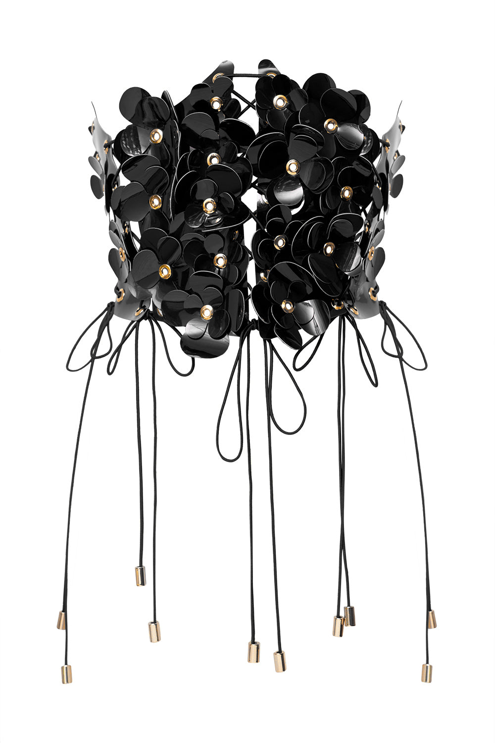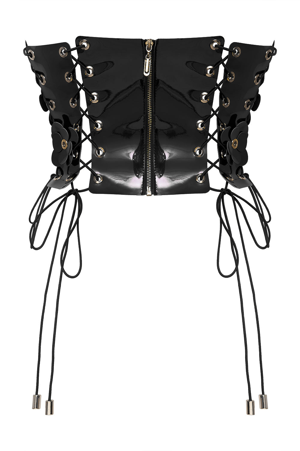 Manufacturer (brand): yesUndress Texture: Glossy Color: Black Design: Adjustable open corset with flower decor The main fabric: Patent PU leather Lining fabric: Soft velour Fittings: Bronze Gilded with fine gold Composition: 100% PU leather Dimensions: Onesize from XS-S to 4XL Place of origin: Ukraine